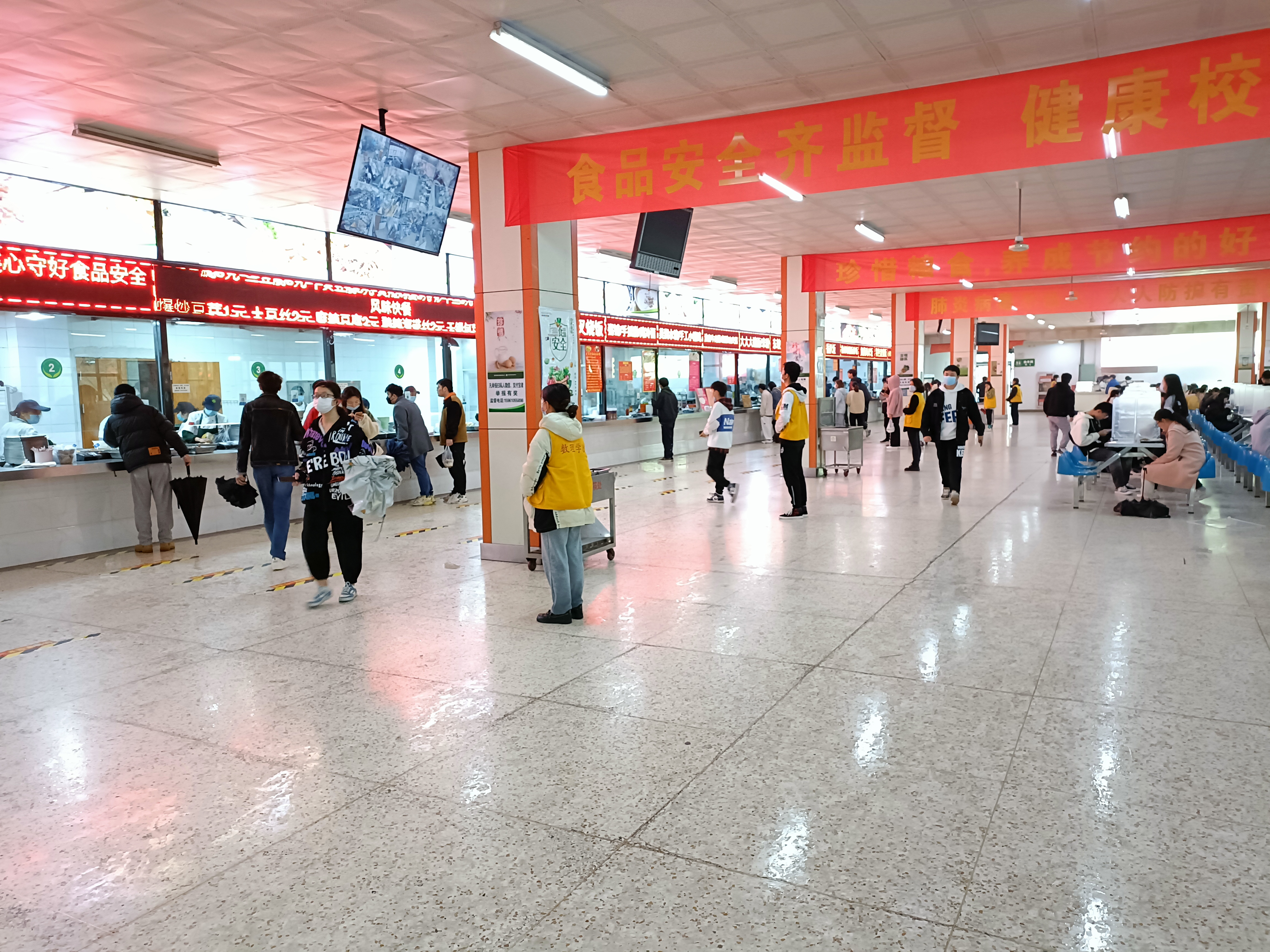 疫情防控期间,志愿者们走进了食堂,成为食堂引导员。引导就餐同学在有序排队,保持一米线距离,为疫情防控做贡献。