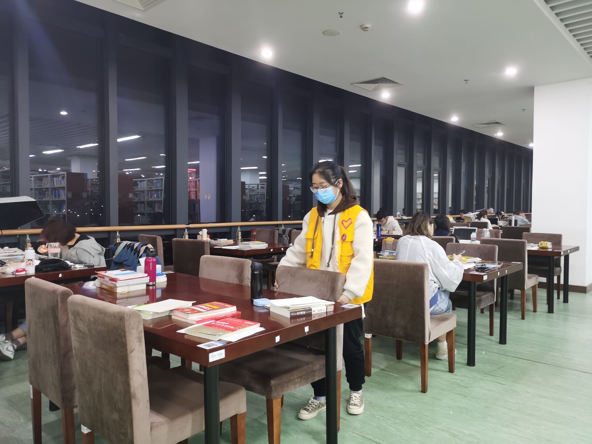 为给大家营造良好的学习氛围,学院志愿者将图书馆自习室的桌椅摆放整齐,对书桌上凌乱的书籍进行了整理,美化了校园学习环境。